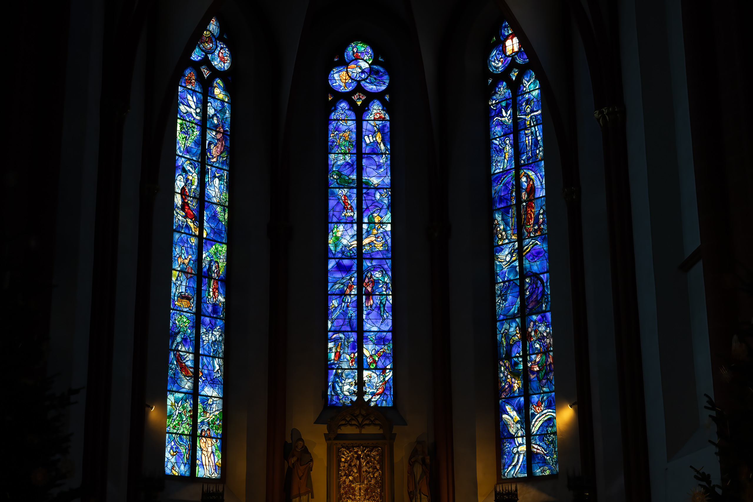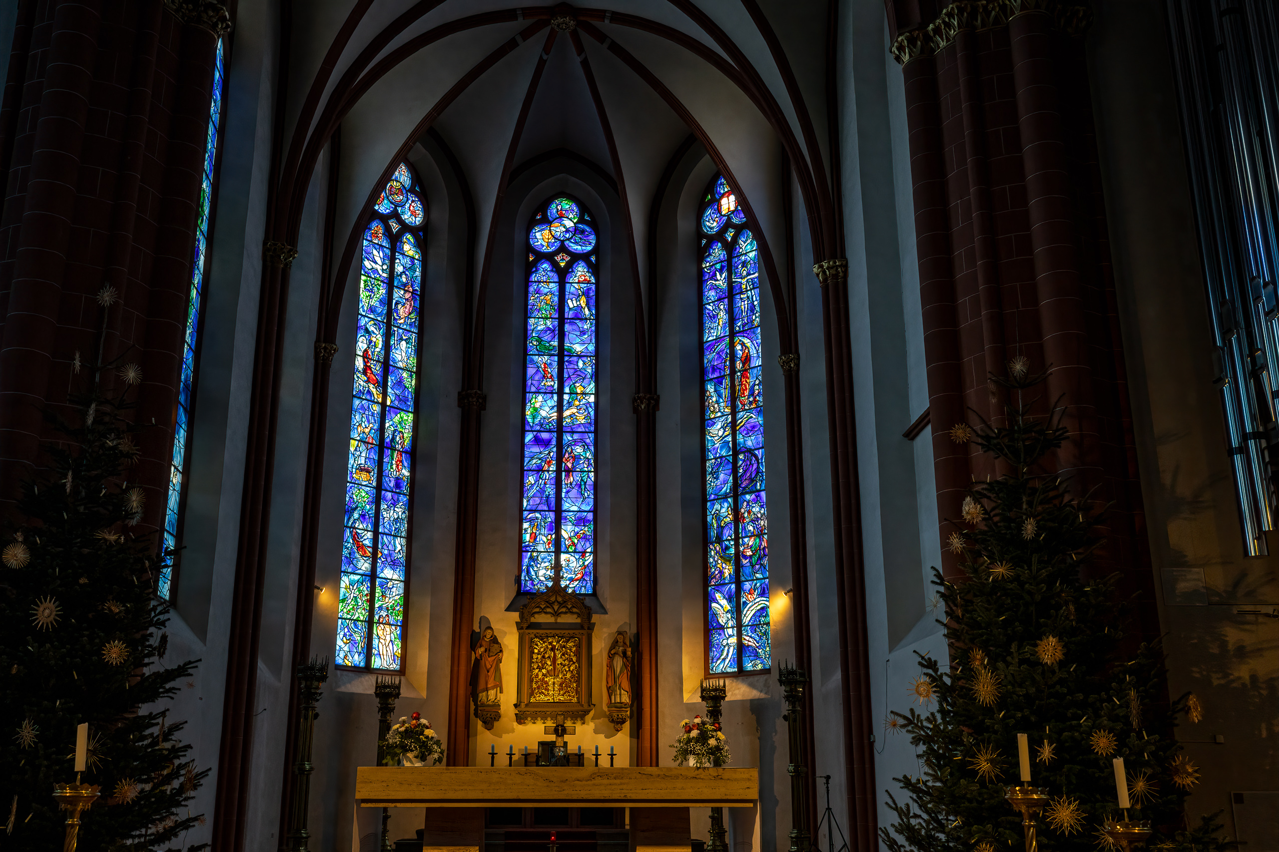 Die Fenster in der Kirche St. Stephan (Mainz) gehören zu den eindrucksvollsten Beispielen moderner Glasmalerei in einem historischen Kirchenraum. gehören zu den eindrucksvollsten Beispielen moderner Glasmalerei in einem historischen Kirchenraum. Entworfen wurden sie von Marc Chagall, der zwischen 1978 und 1985 mehrere Fenster für diese Kirche gestaltete. Die intensiv blauen Glasflächen mit ihren biblischen Motiven tauchen den Innenraum in ein besonderes Licht und verleihen der Architektur eine ruhige und zugleich spirituelle Atmosphäre.