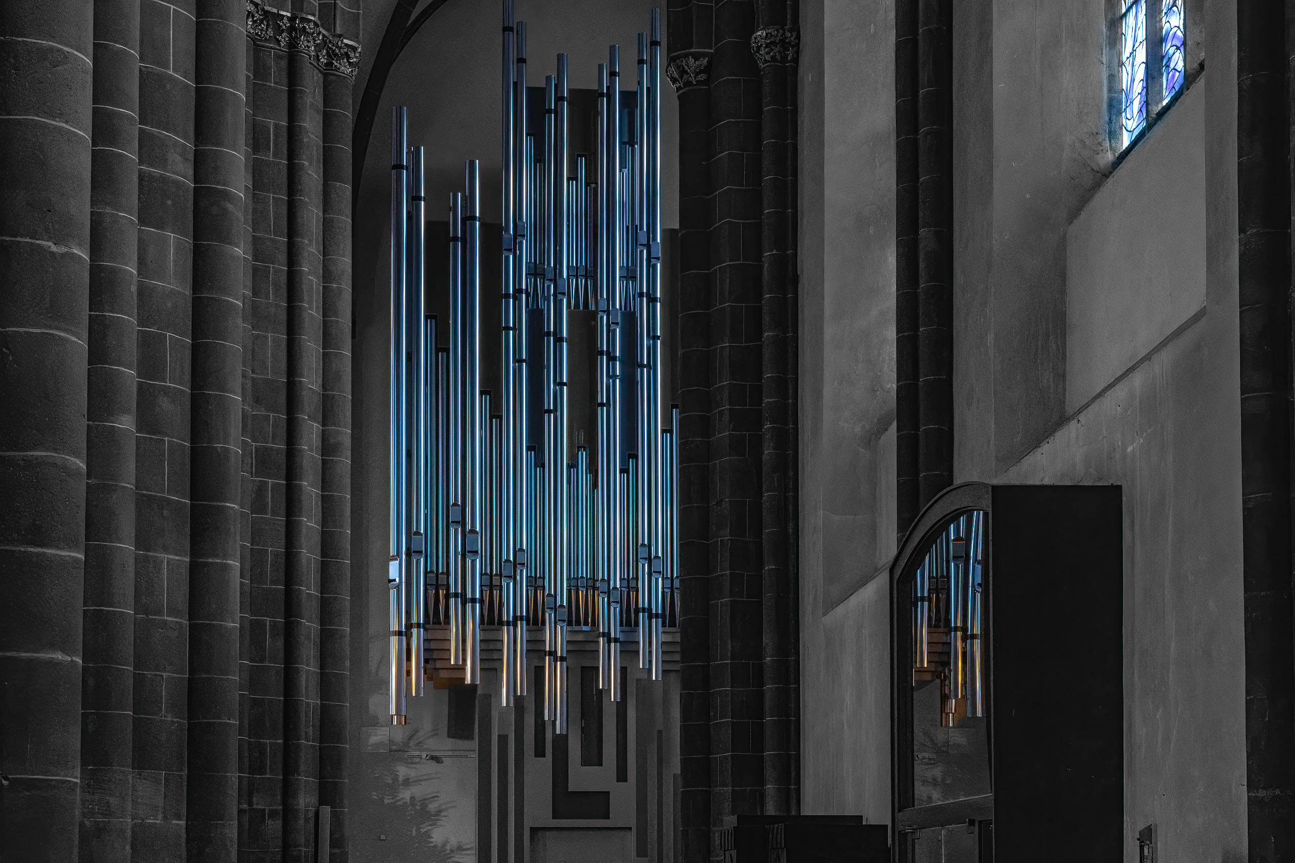 In der fotografischen Darstellung steht weniger das einzelne Fenster im Mittelpunkt als das Zusammenspiel von Raum, Licht und Struktur. Das blaue Licht fällt durch die hohen Fenster in den Kirchenraum und verändert die Wahrnehmung der Architektur. Linien, Gewölbe und Perspektiven treten deutlicher hervor und führen den Blick durch den Raum. Die Bilder greifen genau diese Wirkung auf und zeigen, wie Licht zum eigentlichen Gestaltungselement der Architektur wird.