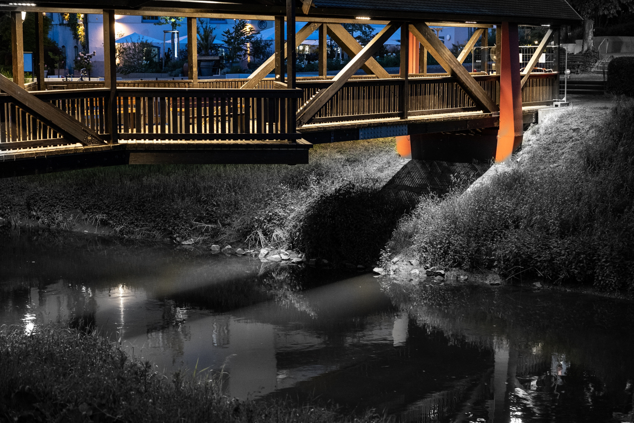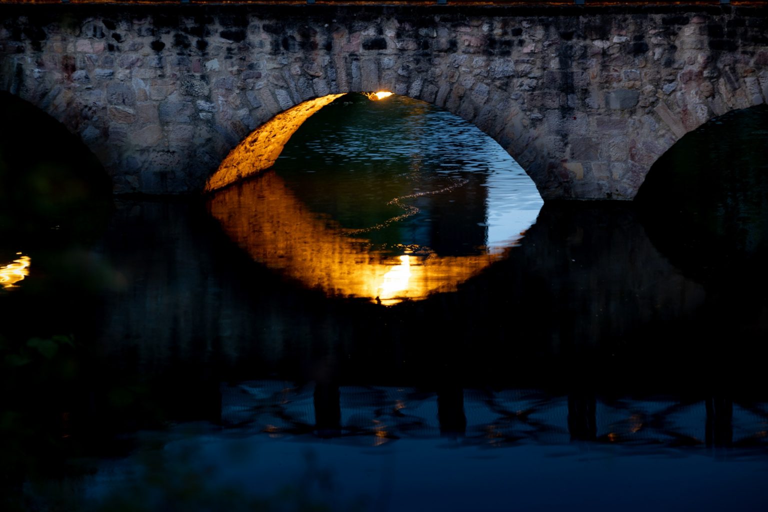 Bad Vilbel Herbst 2022 Fotoserie Aloys Peter Trenz Abendliche Spiegelung von Steinbrücke im Wasser