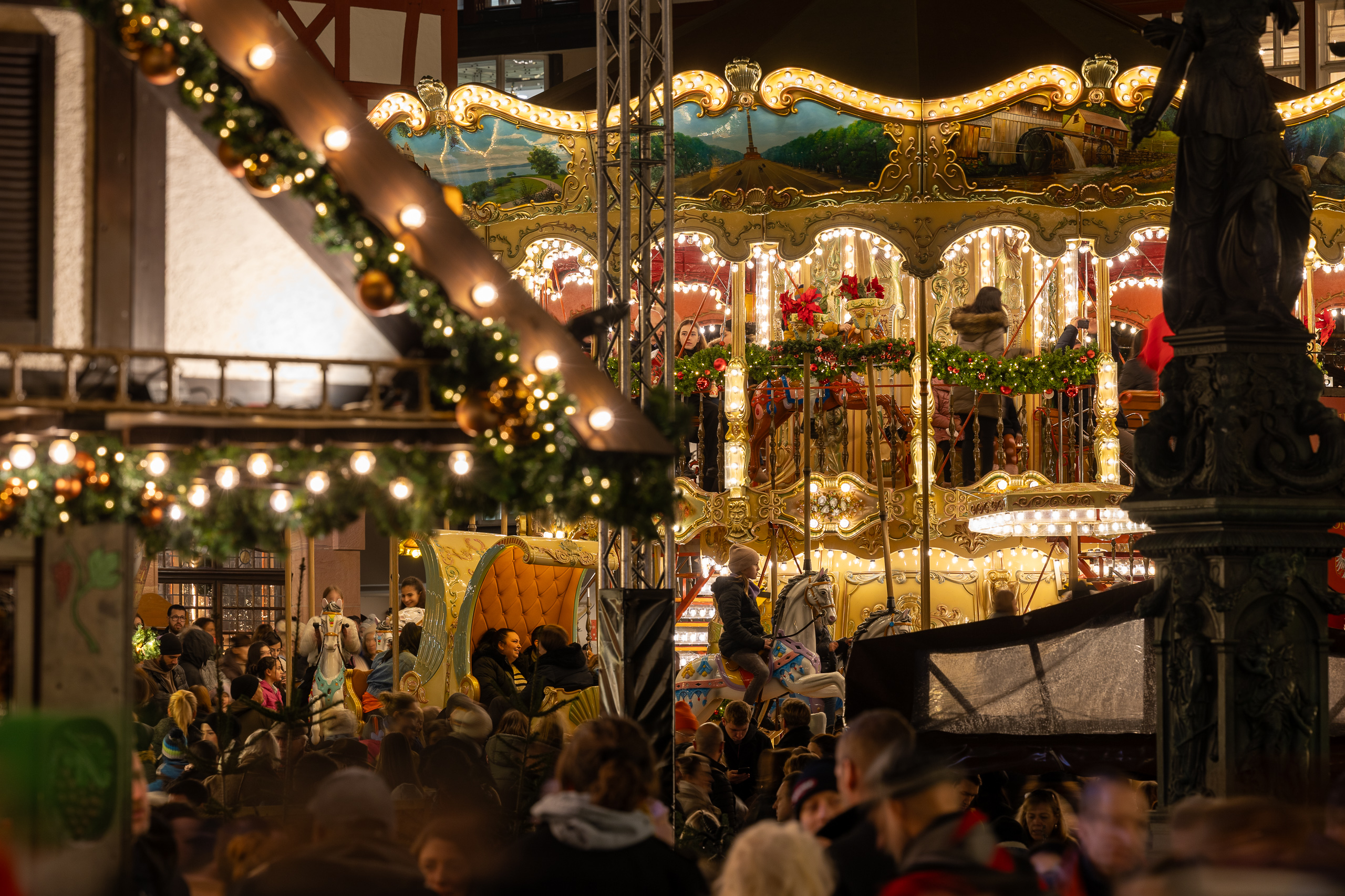 Der Römerberg gehört zu den bekanntesten Orten Frankfurts. Die historischen Fachwerkhäuser und das Rathaus bilden eine Kulisse, die gerade zur Weihnachtszeit eine ganz besondere Wirkung entfaltet. Zwischen festlich geschmückten Marktständen, dem großen Weihnachtsbaum und den Lichterketten entsteht eine Atmosphäre, die Tradition und Stadtleben miteinander verbindet.