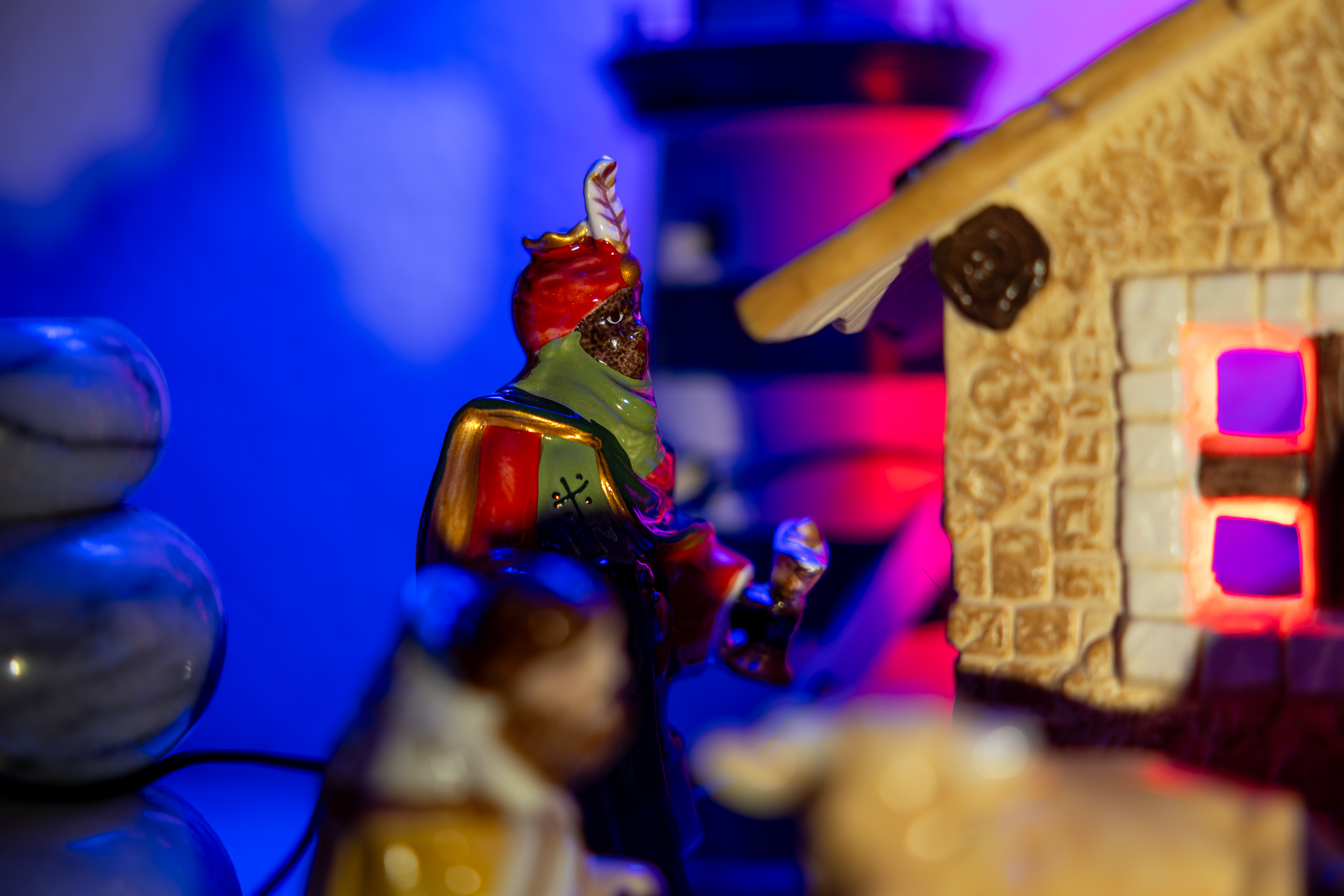 Durch die Makrofotografie entsteht eine eigene Bildwelt. Die Krippe wirkt nicht mehr wie ein dekoratives Objekt, sondern wie eine kleine Bühne mit Ruhe und Tiefe. Auch der Weihnachtsschmuck ergänzt diese Atmosphäre – reduziert, still und konzentriert auf Form und Wirkung.