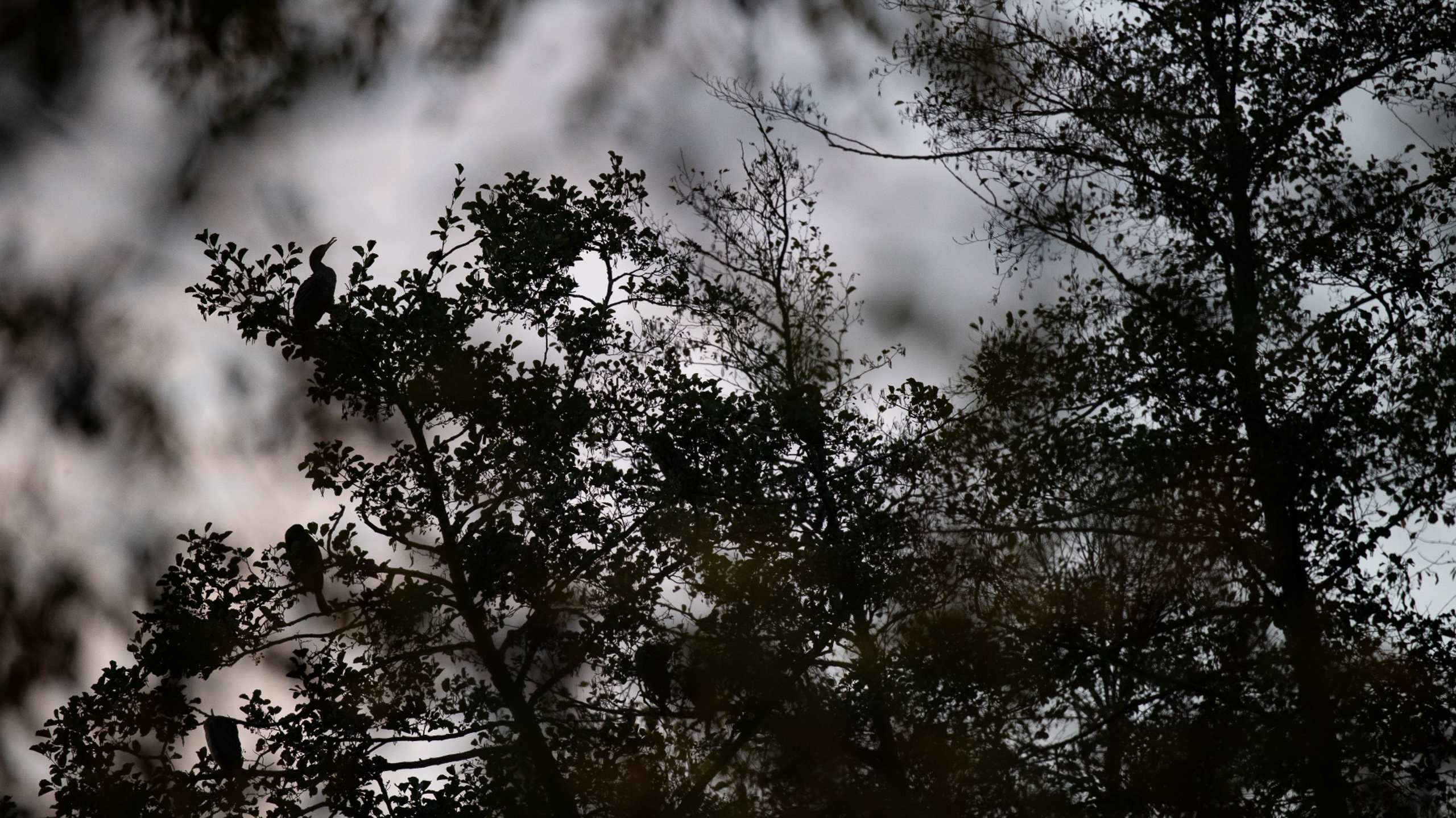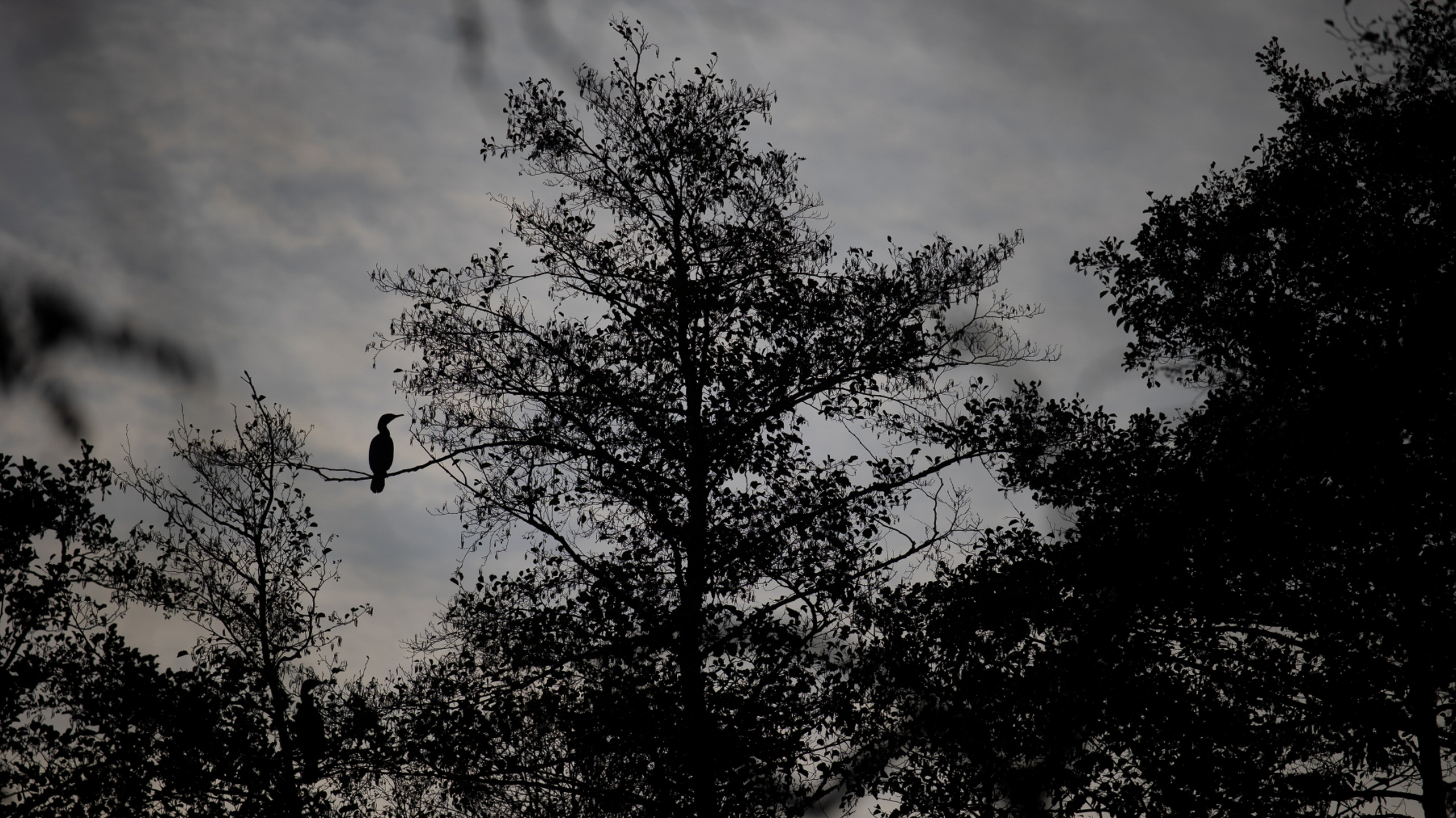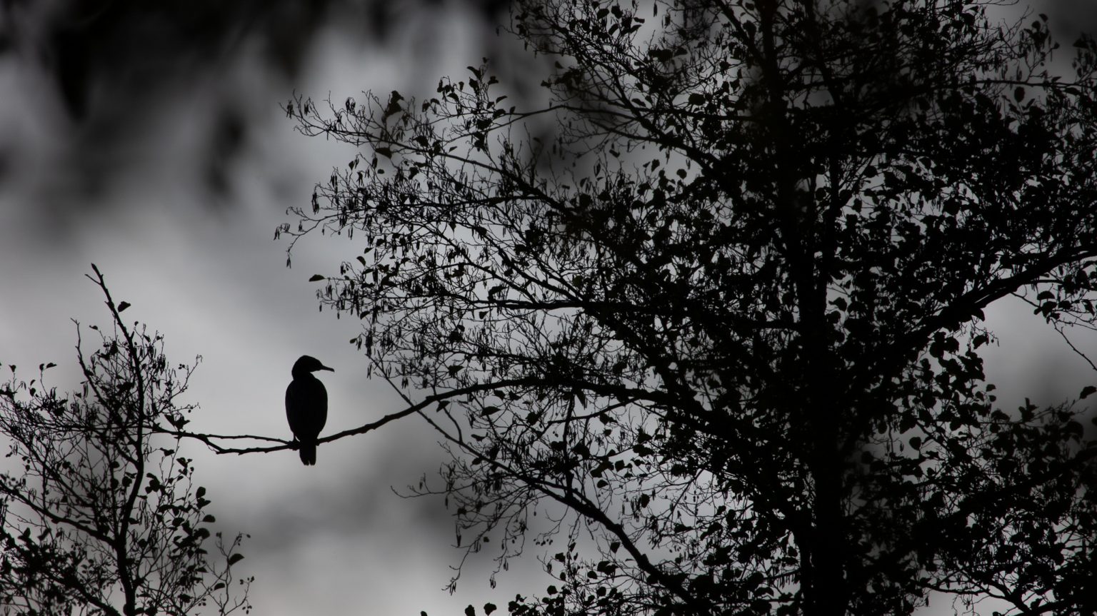 Tier- und Naturfotografie Jacobiweiher Frankfurt Oktober 2022 Vogel-Silhouette auf Ast in einem nebligen Wald