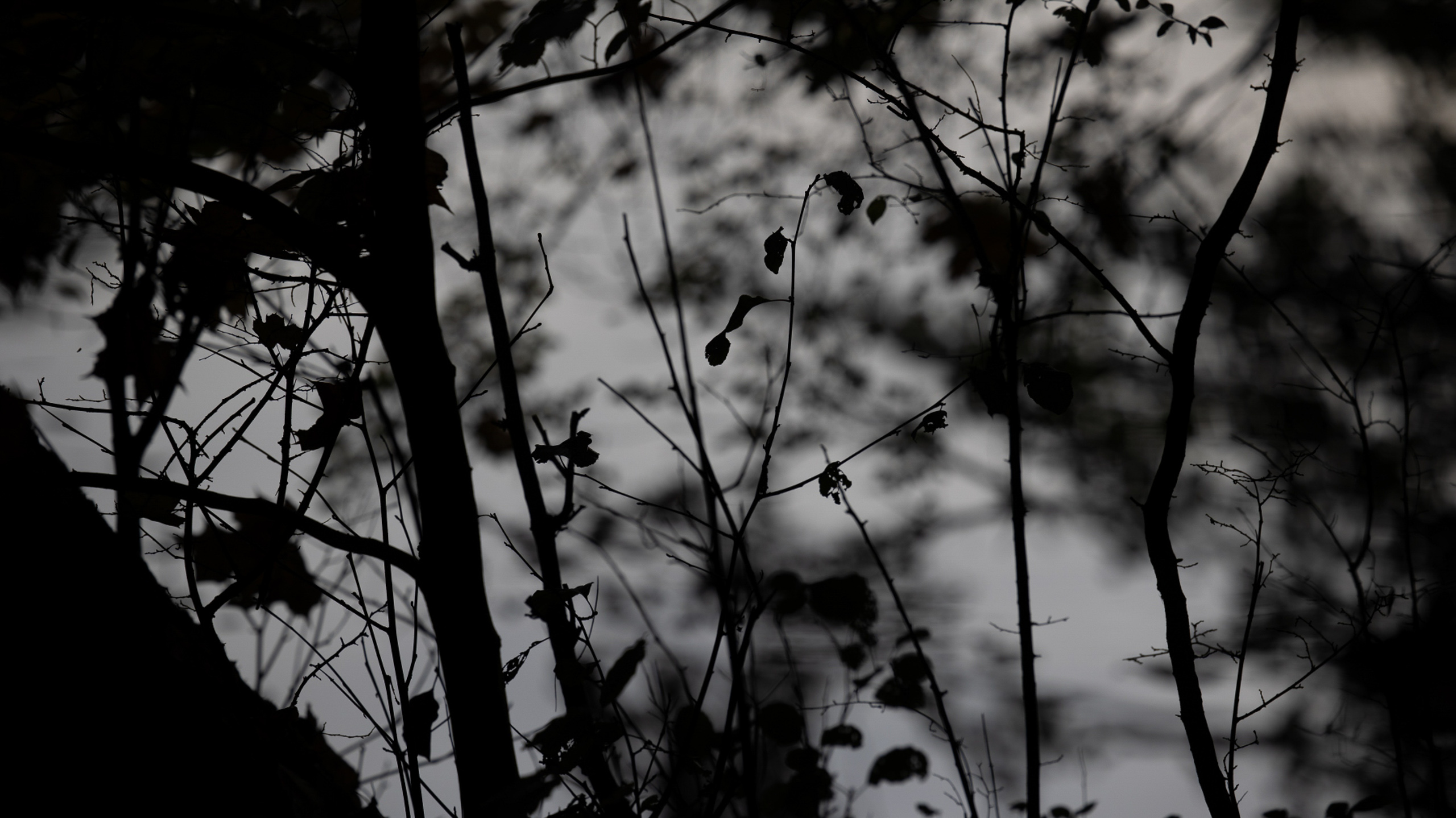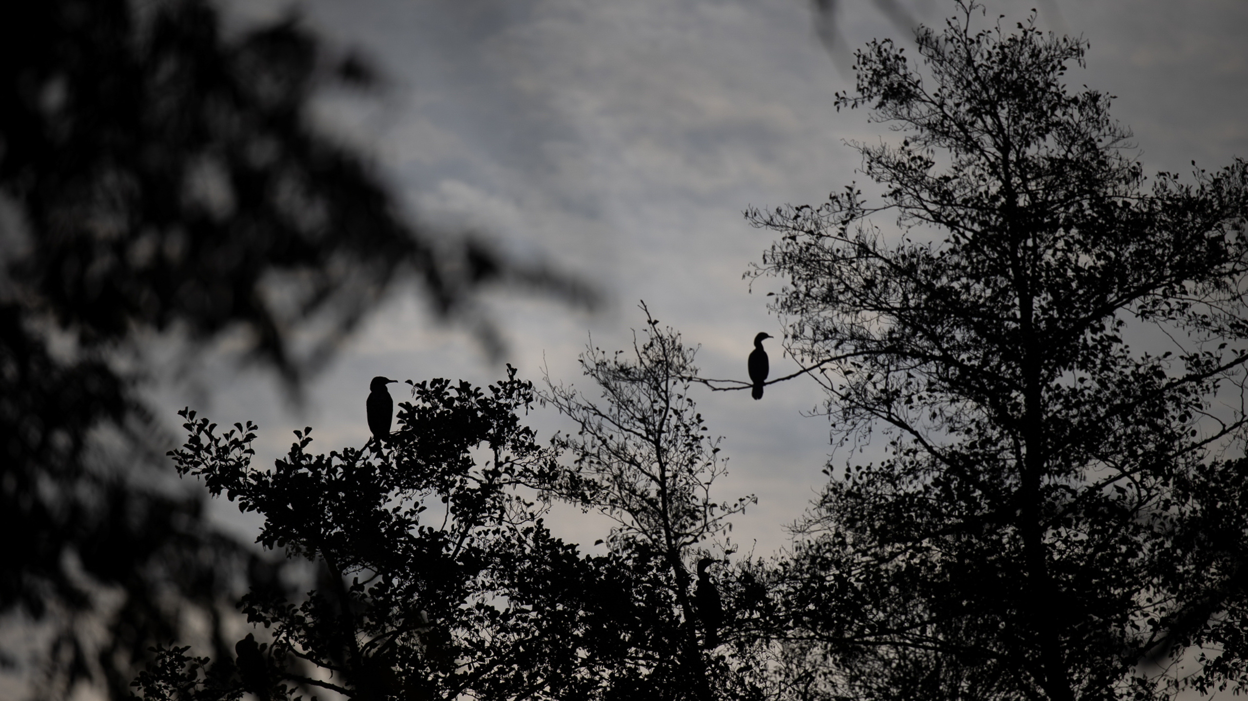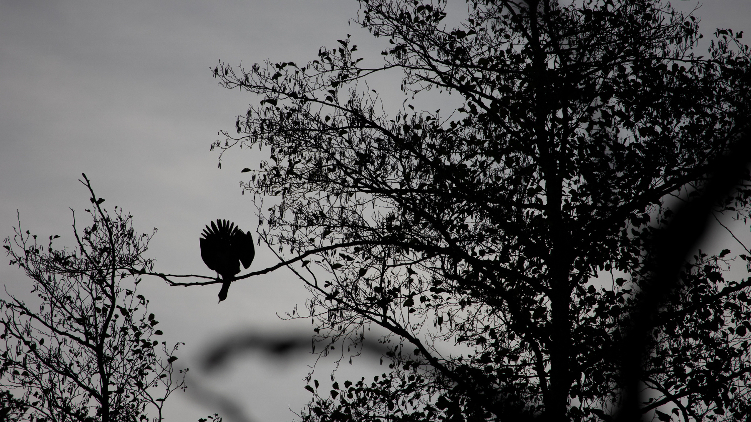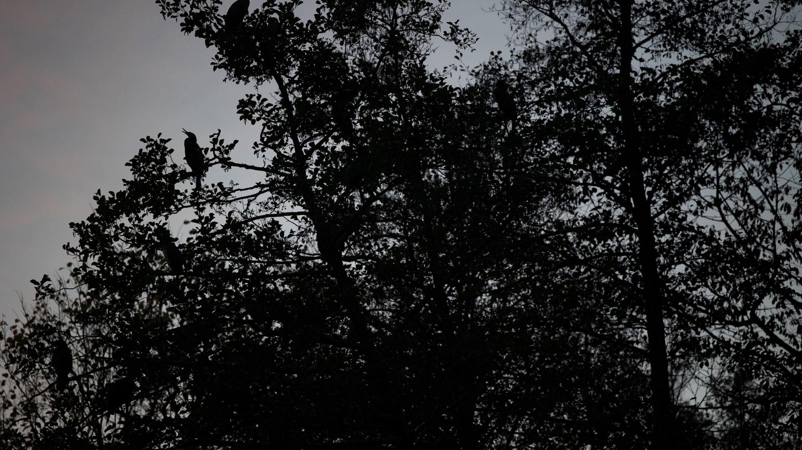 Tier- und Naturfotografie Jacobiweiher Frankfurt Oktober 2022 Vogel-Silhouette auf Ast in einem nebligen Wald