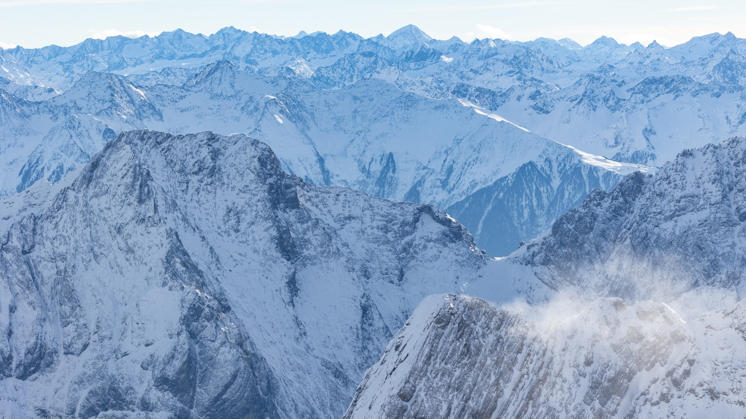 Für die Landschaftsfotografie bietet die Zugspitze außergewöhnliche Perspektiven. Von hier oben öffnet sich ein Panorama über die Alpen, das sich über Bayern, Tirol und weit in die umliegenden Gebirgszüge erstreckt. Die Vielzahl der Gipfel, die sich bis zum Horizont aneinanderreihen, macht die Dimension dieser Landschaft besonders eindrucksvoll.